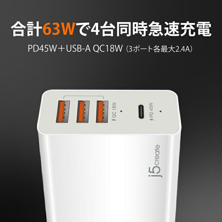 45W Power Delivery 合計出力63Wで4台のデバイスに同時に充電できるUSB充電器です。