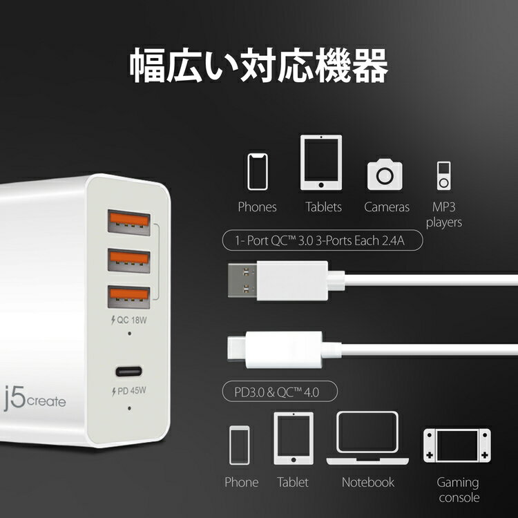 (USB Type-A×3ポート、USB Type-C×1ポート) USB-Cポートは PD3.0&QC4.0に両対応、5V/9V/12V/15V/20Vに対応し、最大45WまでPD対応のパソコン、タブレット、スマホに充電可能です。